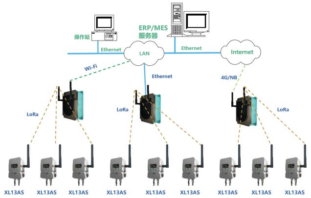 XL13AS 无线风管风速传感器通过 LoRa 无线传输方式,将数据上传至 XL906 物联网关 ,网关可选以太网、 Wi-Fi 、 4G 通信方式,推送数据至监管平台、企业生产管控服务器等。